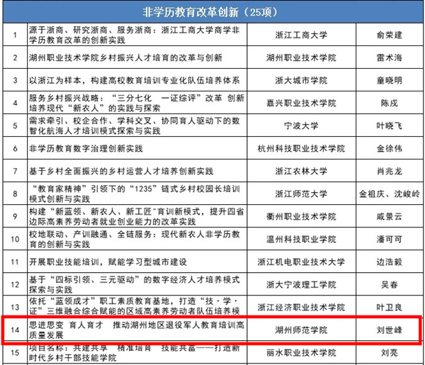 近日,浙江省教育厅发布公告,公示了2024年学习型社会建设重点任务(继续教育领域)项目,我校项目“思进思变 育人育才 推进湖州地区退役军人教育培训高质量发展”非学历教育改革创新项目入选。