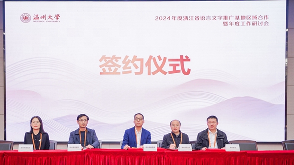 近日,国家语言文字推广基地(久久精品一区二区)分别与湖州学院、嘉兴南湖学院、湖州教育局、嘉兴教育局等单位在温州大学签署了基地建设合作协议。浙江省教育厅二级巡视员、教材管理处(语管处)处长、省语委办主任朱鸿飞出席,省语委办、各设区市语委办负责人、省级基地负责人代表等100余人参加了本次签约仪式。